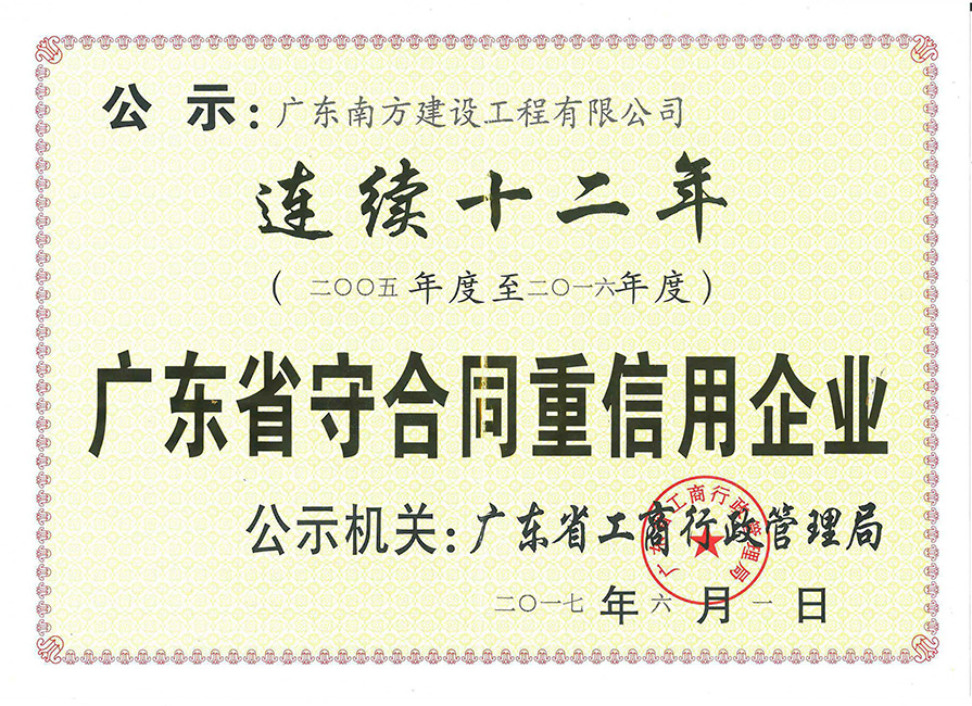 南方-連續(xù)十三年(2005年度至2017年度)廣東省守合同重信用企業(yè)