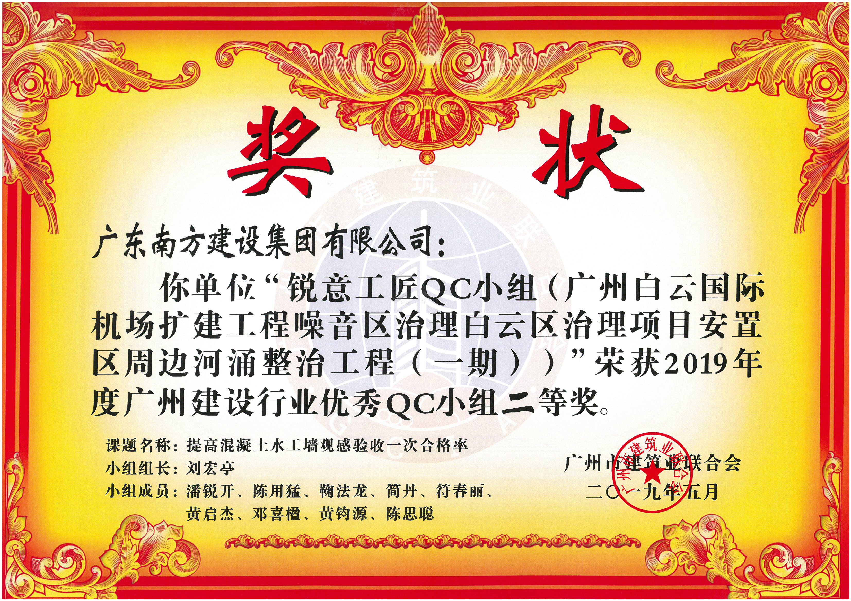 2019年度廣州建設(shè)行業(yè)優(yōu)秀QC小組二等獎(廣州白云國際機(jī)場擴(kuò)建工程噪音區(qū)治理白云區(qū)治理項(xiàng)目安置區(qū)周邊河涌整治工程