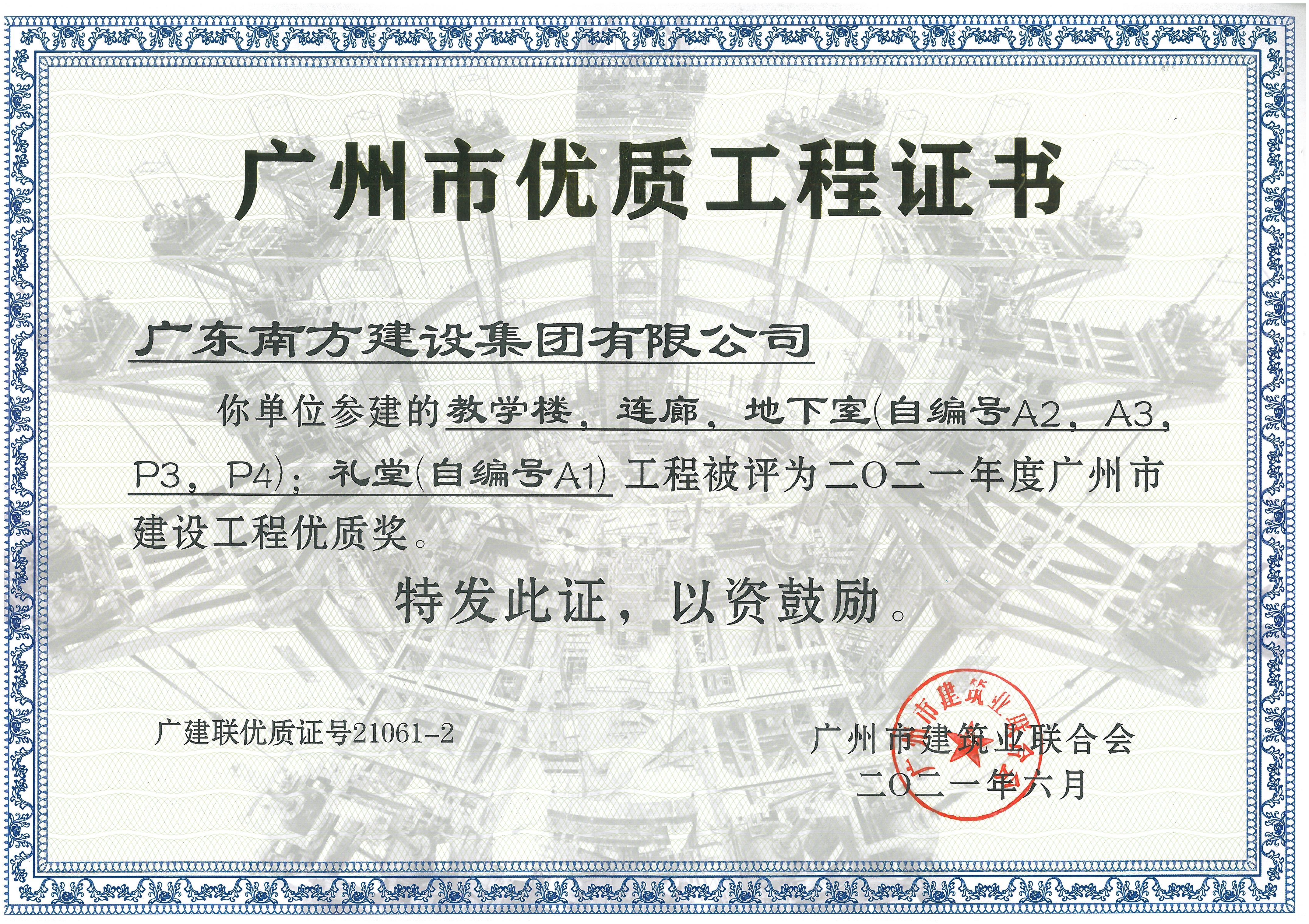 廣州市優(yōu)質(zhì)工程證書——增城老年大學(xué)