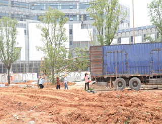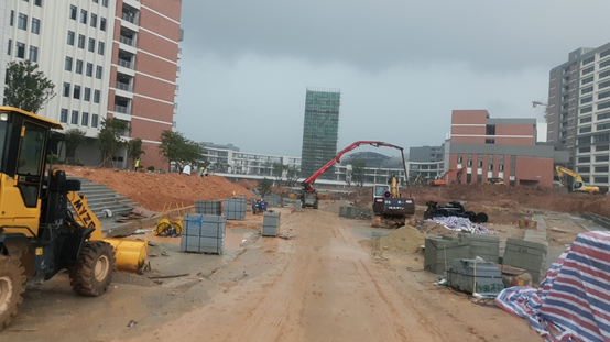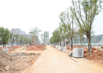往學(xué)校中心日晷廣場望去,學(xué)校中軸線道路兩側(cè)栽種了滿滿的香樟樹、人面子樹和鳳凰木等,并一一做好固定支架;校園內(nèi)主干道路正在清理施工廢棄物即將進(jìn)行瀝青鋪設(shè);人行通道同步開始鋪設(shè)園林透水磚,種植綠化草皮。午飯后的綠化工人們加緊種植綠化樹木,現(xiàn)場揮汗如雨。