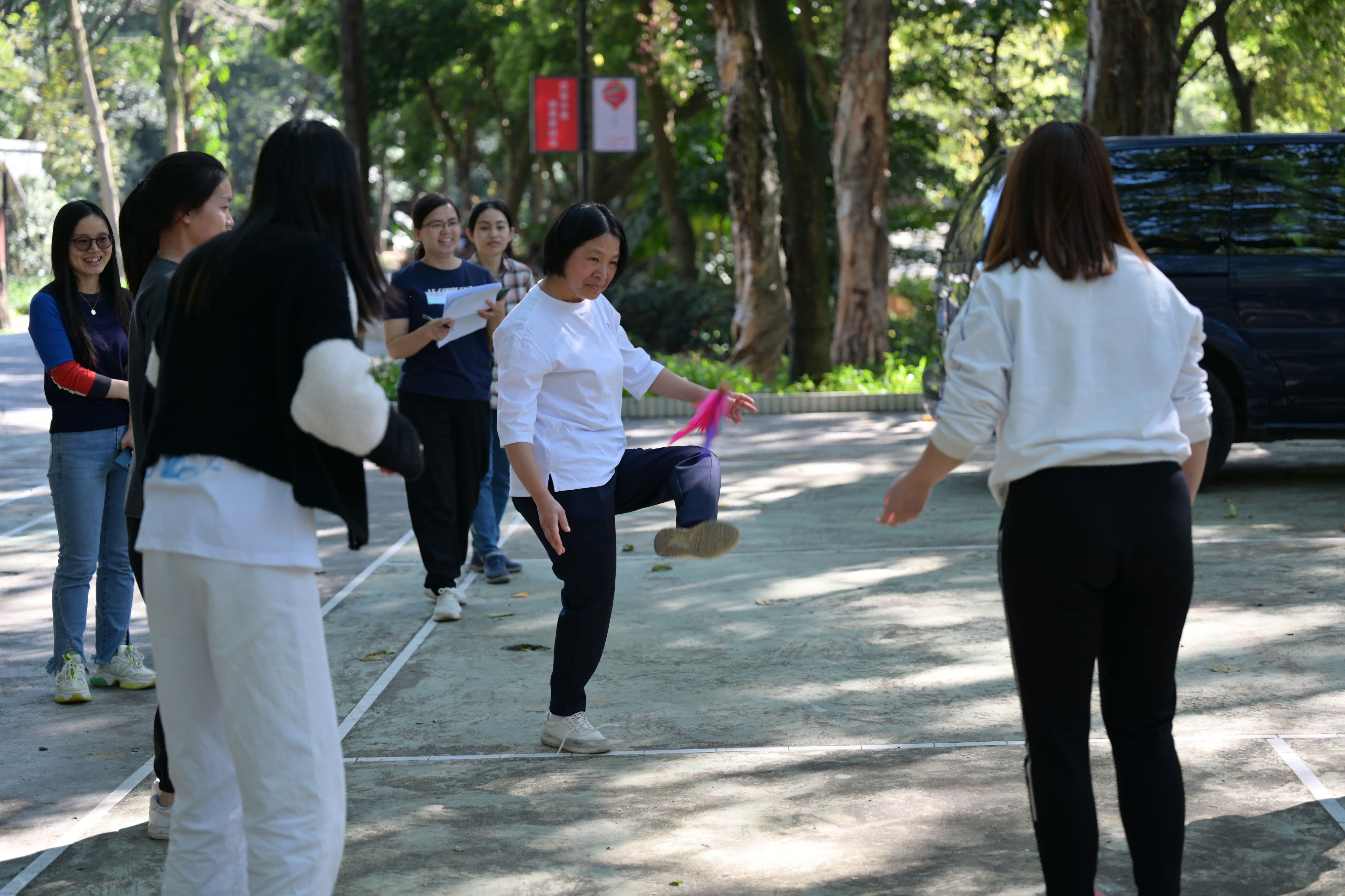 在明珠樓廣場(chǎng)開(kāi)展團(tuán)隊(duì)踢毽子比賽,以組為單位爭(zhēng)相競(jìng)技,五彩的毽子 在腳尖上輕盈飛舞,此起彼伏, 賽場(chǎng)上氣氛歡快激烈,不時(shí)迎陣陣喝彩。