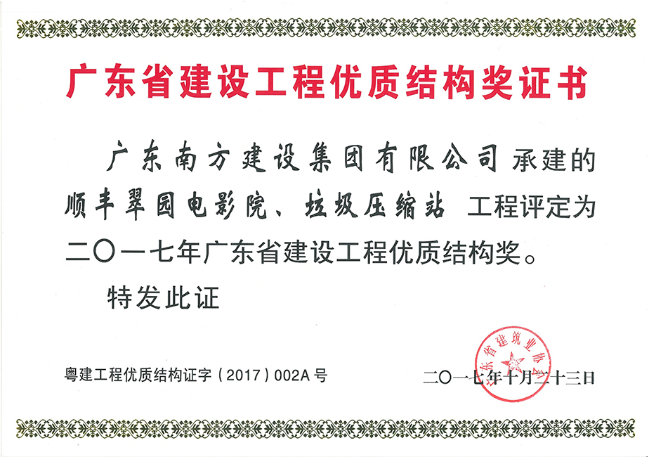 • 順豐翠園電影院、垃圾壓縮站工程-廣東省建設(shè)工程優(yōu)質(zhì)結(jié)構(gòu)獎(jiǎng)