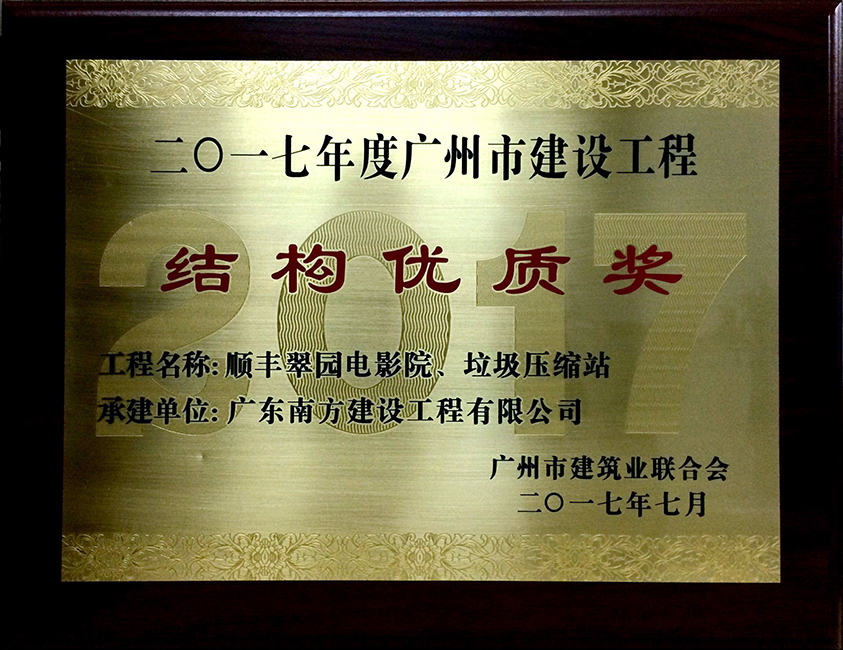 • 順豐翠園電影院、垃圾壓縮站工程-廣州市建設(shè)工程結(jié)構(gòu)優(yōu)質(zhì)獎(jiǎng)-牌匾