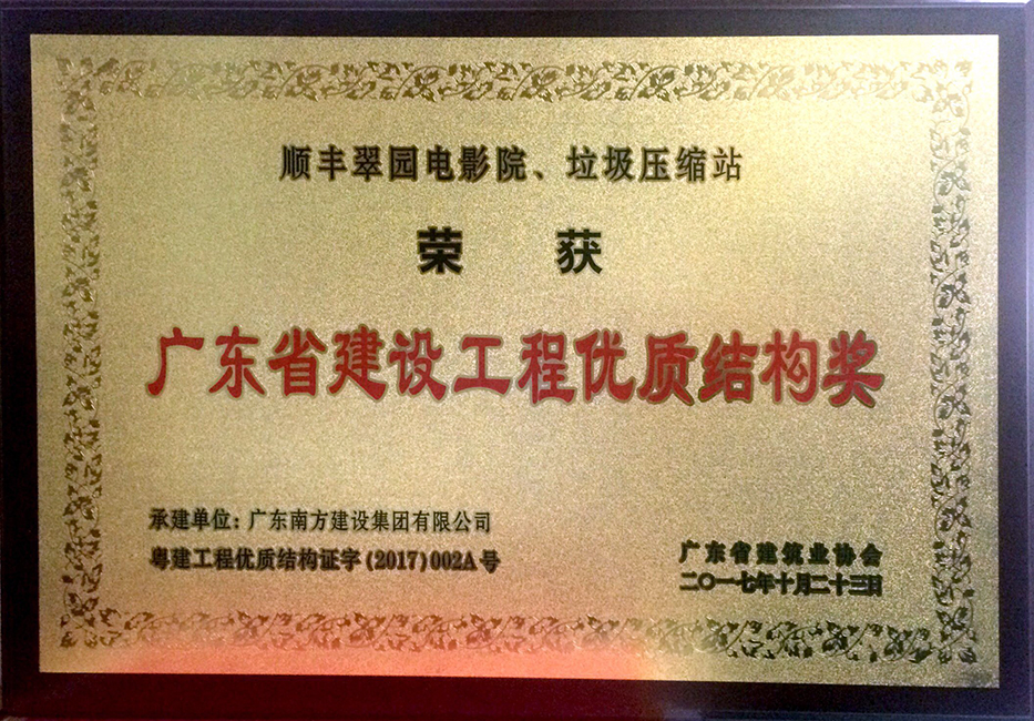 • 順豐翠園電影院、垃圾壓縮站工程-廣東省建設(shè)工程優(yōu)質(zhì)結(jié)構(gòu)獎(jiǎng)-牌匾