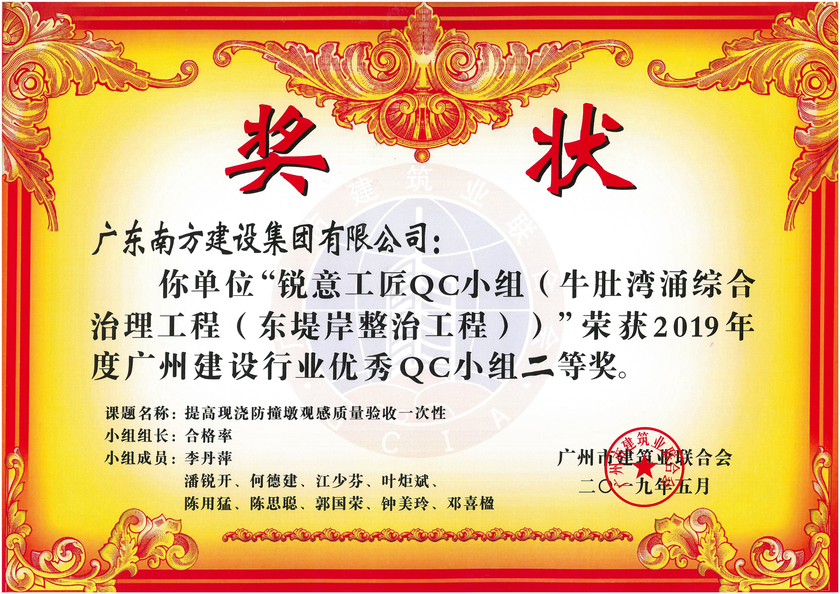 2019年度廣州建設(shè)行業(yè)優(yōu)秀QC小組二等獎(牛肚灣涌綜合治理工程(東堤岸整治工程)
