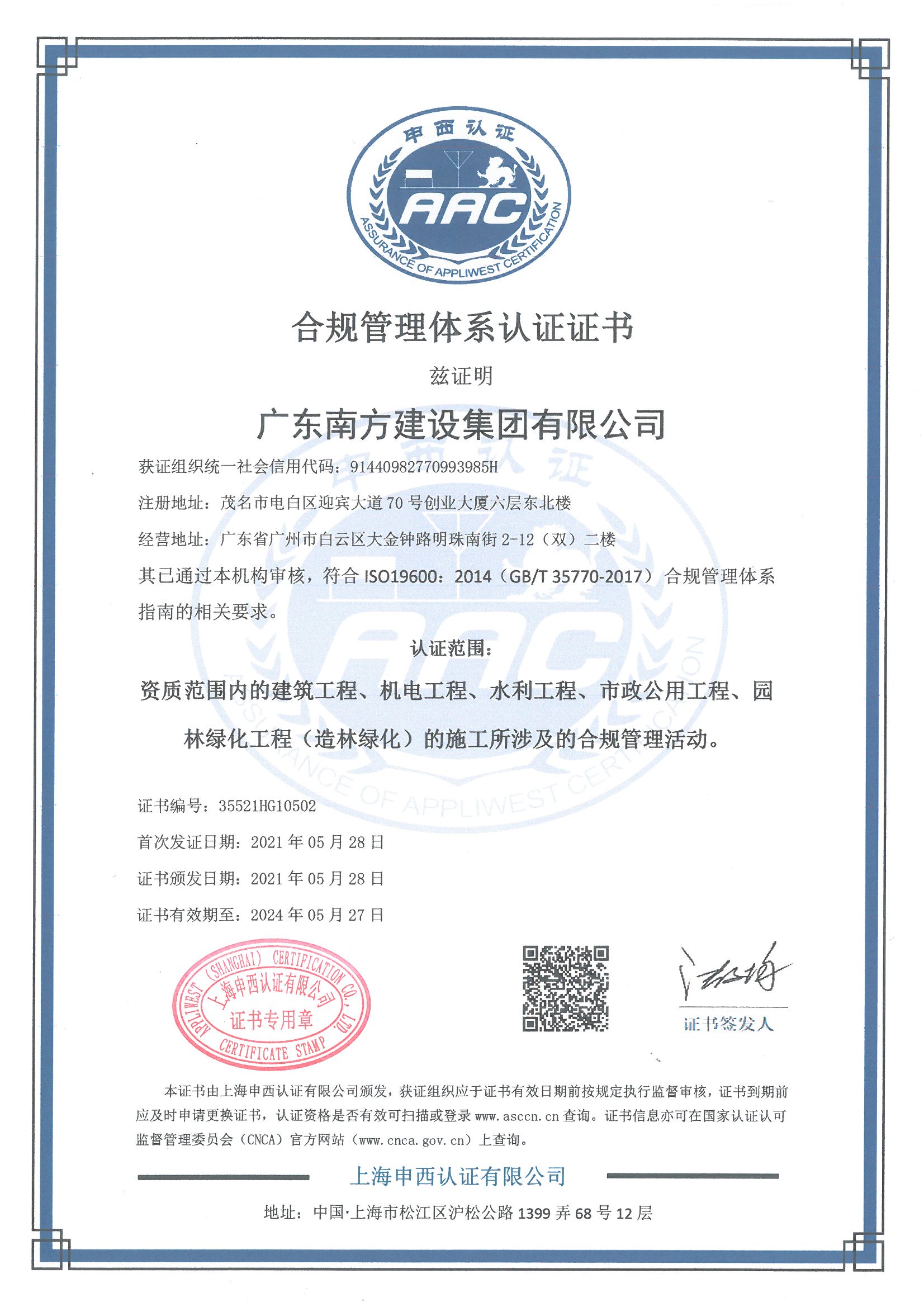 合規(guī)管理體系認(rèn)證證書